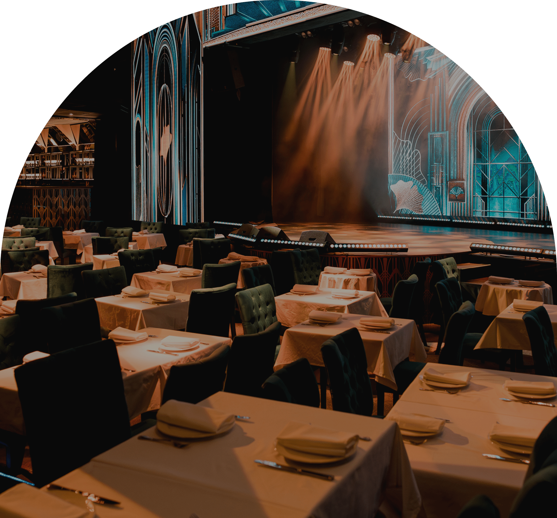 Двухъярусный зал в формате амфитеатра выдержан в стилистике ар-деко и даст каждому из присутствующих почувствовать себя в центре событий. Зал с комфортом вмещает до 250 гостей и благодаря продуманному зонированию и передовому техническому оснащению предоставляет организаторам возможность воплотить самые смелые фантазии.