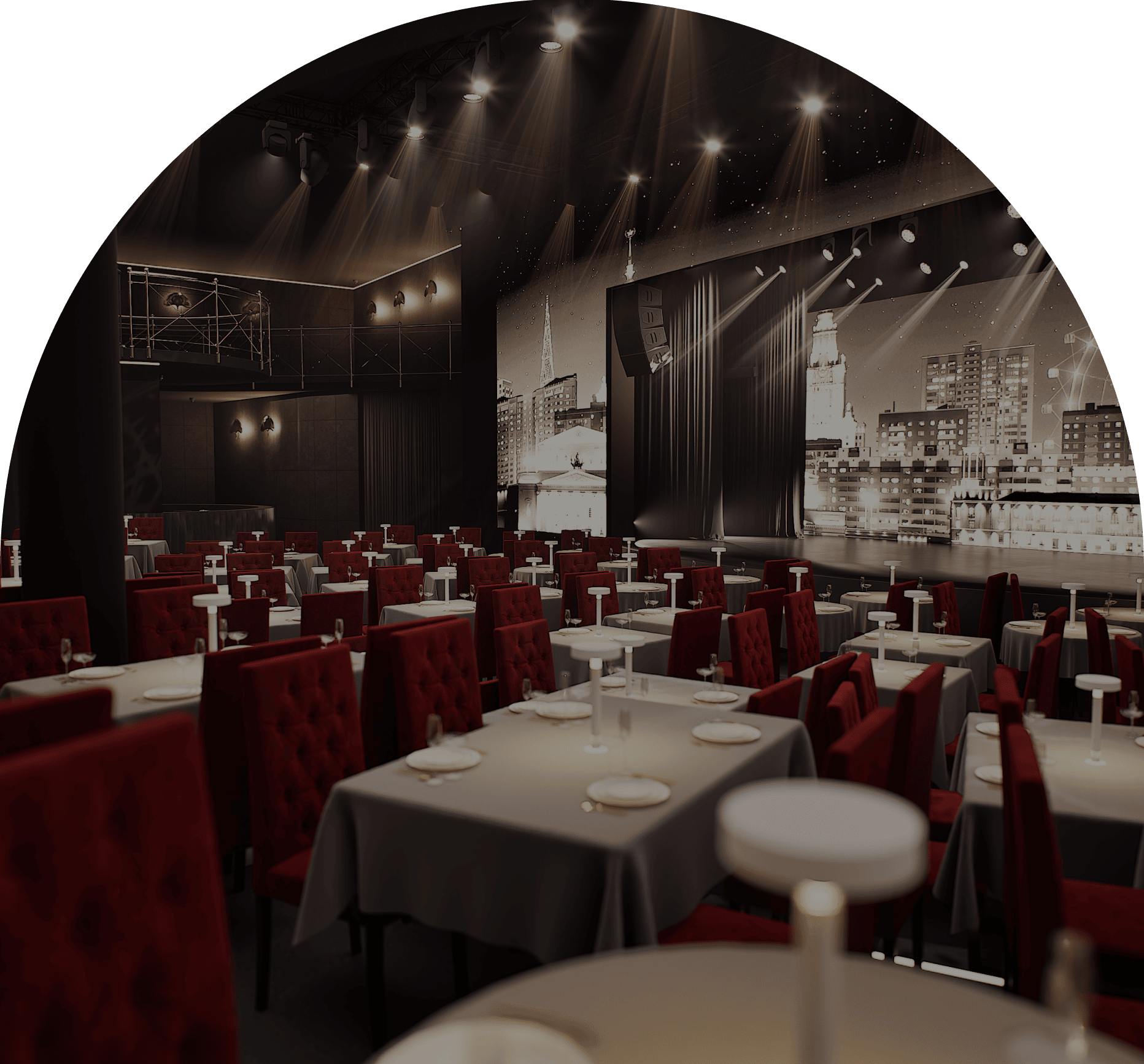 Двухъярусный зал в формате амфитеатра выдержан в стилистике ар-деко и даст каждому из присутствующих почувствовать себя в центре событий. Зал с комфортом вмещает до 250 гостей и благодаря продуманному зонированию и передовому техническому оснащению предоставляет организаторам возможность воплотить самые смелые фантазии.